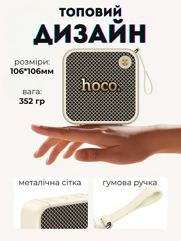 Портативна Bluetooth-колонка HOCO — це поєднання стильного ретро-дизайну та сучасних бездротових технологій. Компактний корпус з декоративною металевою решіткою та м’яким покриттям надає пристрою преміального вигляду, який гармонійно доповнить будь-який інтер’єр або образ.